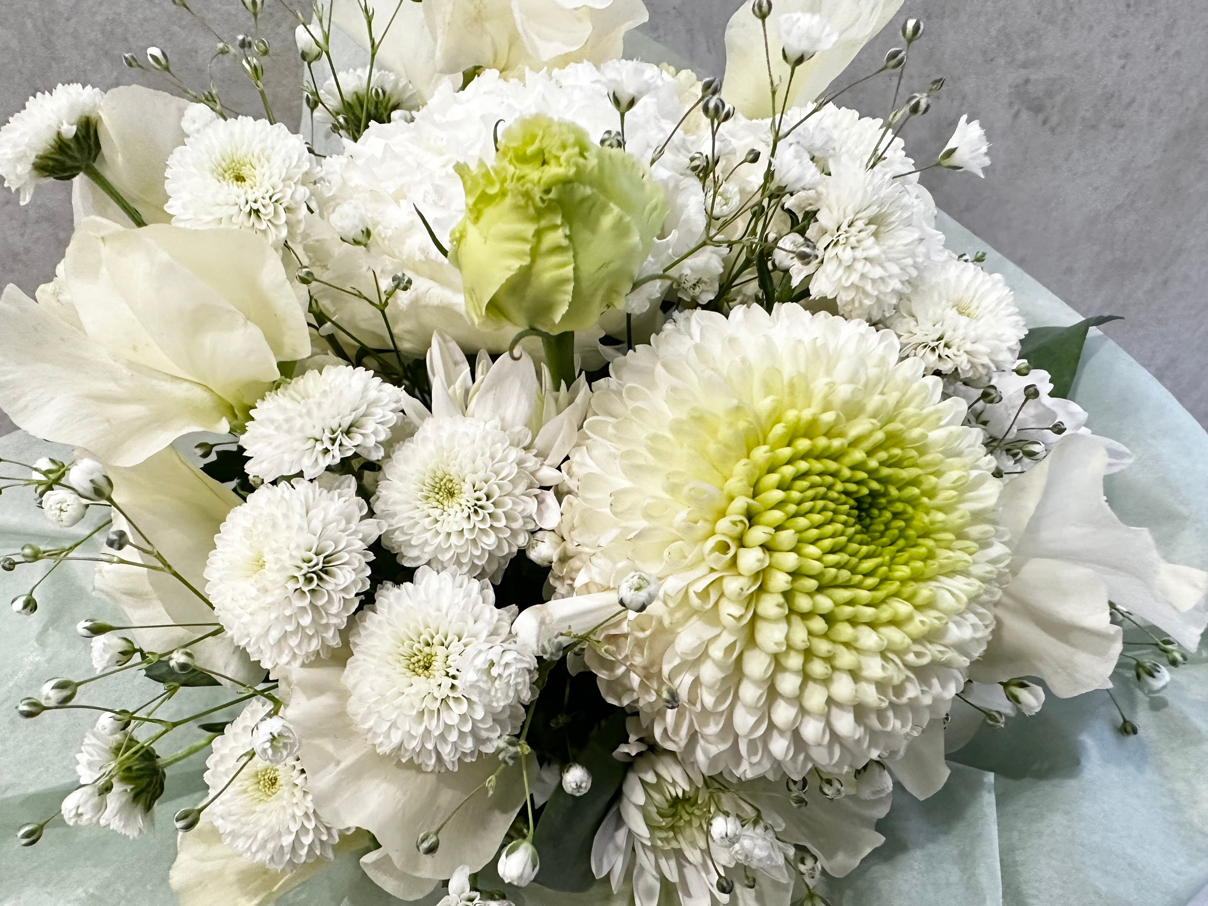 清楚で優しく、お悔やみの気持ちを伝えるのにふさわしいアレンジメントをお届けします。