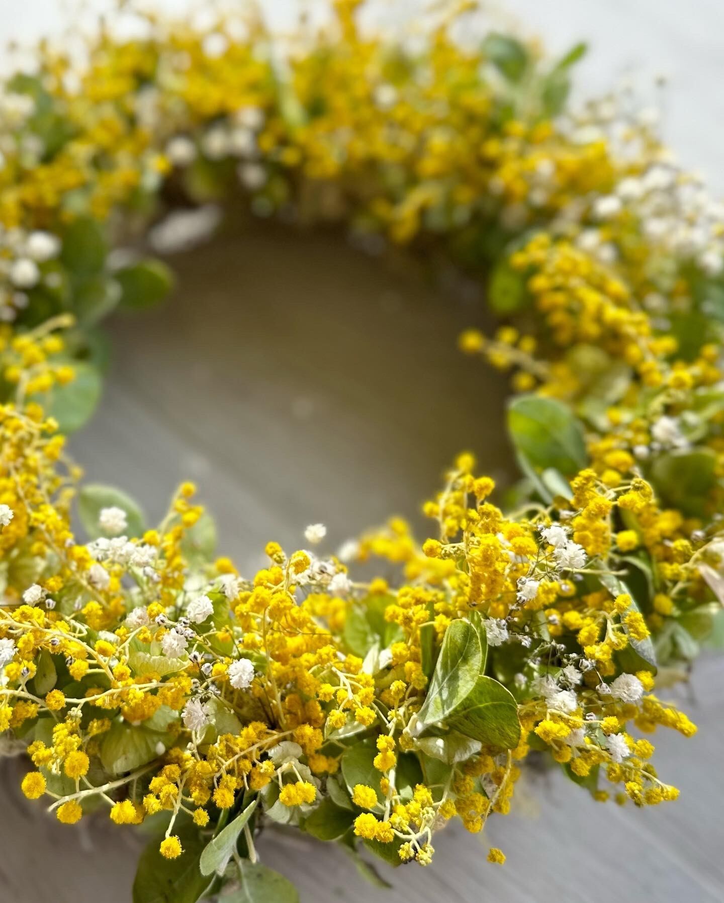 Beige.Flowerオリジナルの立体感のあるミモザリースです。
