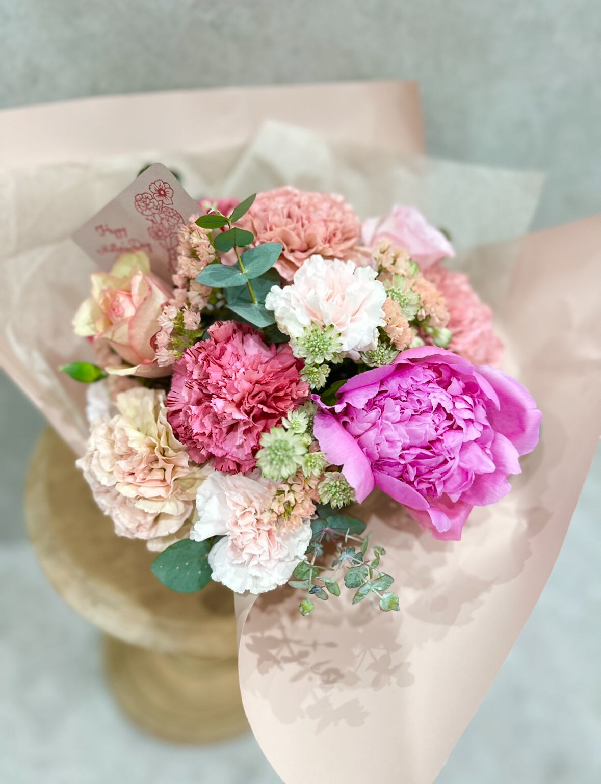 こだわりって選んだピンク系のカーネーションをメインに、バラや小花で母の日の贈り物に相応しいデザインで作成いたします。